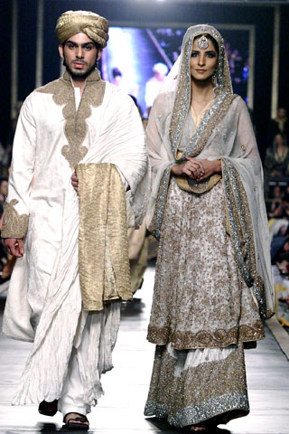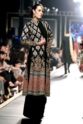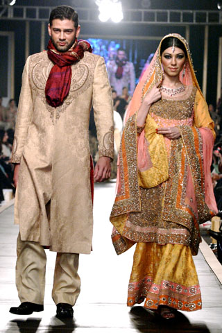 Oh yes, I did go there. I’m just trying to figure out why HSY is so famous. Bunto Kazmi, Karma, Nomi Ansari I can understand, but HSY just puzzles me. I was looking through some of his designs that he showed at Pakistan’s Bridal Couture Week, and while some are fantastic, others are a little too overdone. Take this one for example….
